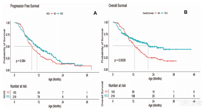 NGS组的中位无进展生存期为11.13个月,置信区间为(9.49,13.70),非NGS组为11.64个月,置信区间为(8.01,6.20)。两组在无进展生存期方面无显著差异(P= 0.064;图1A)。